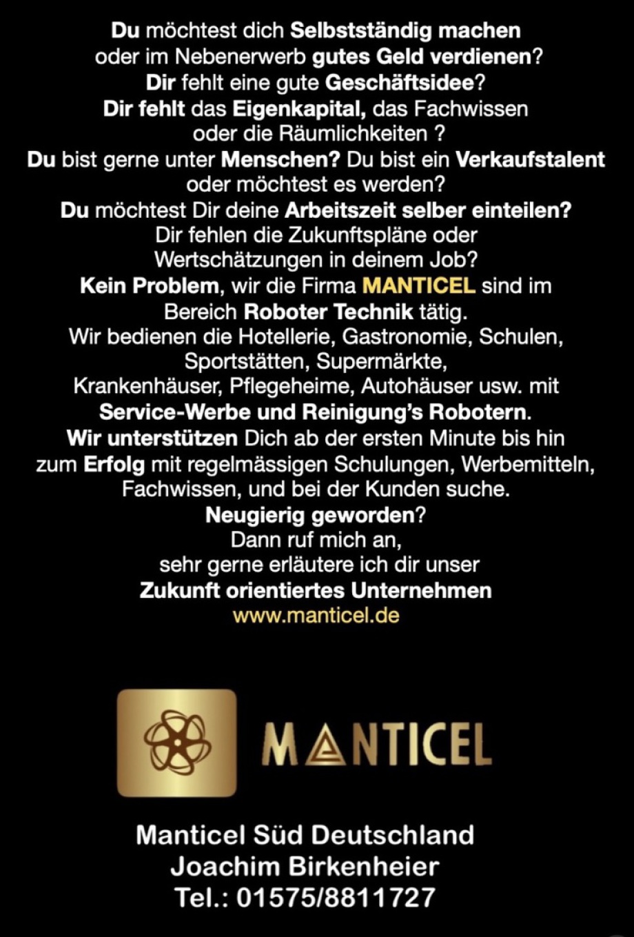 Wir sind ein Junges Unternehmen im Bereich Service Roboter und Warenautomaten und suchen ständig Freie Handelsvertreter die auf Provisions Basis und Selbständig unsere Produkte Vertreiben .